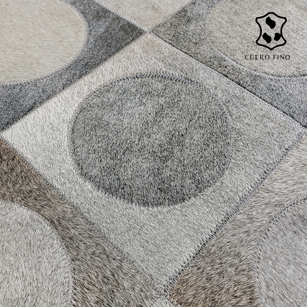 Alfombras de cuero con diseños elaborados a mano 100% cuero vacuno natural cosido a maquina. Tiene un juego de colores grises claros y oscuros. Imagina lo elegante que quedaría esta alfombra en tu espacio.