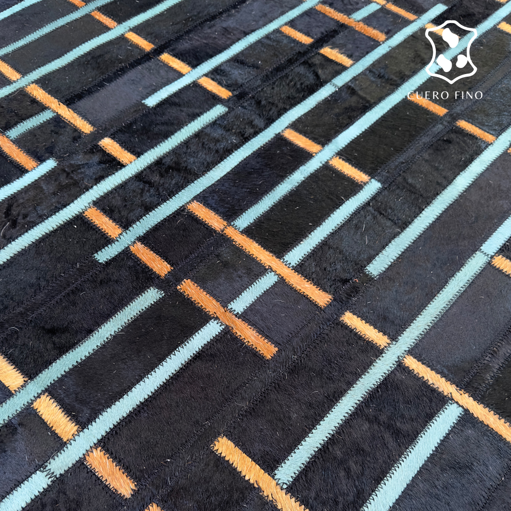 Alfombras de cuero con diseños elaborados a mano 100% cuero vacuno natural cosido a maquina. Tiene un juego de colores negro, azul y amarillo. Imagina lo elegante que quedaría esta alfombra en tu espacio.