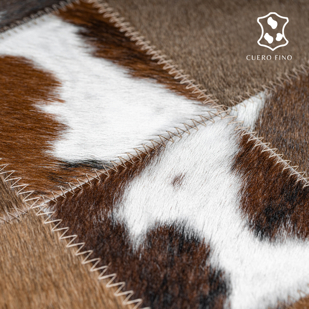 Alfombras de cuero con diseños elaborados a mano 100% cuero vacuno natural cosido a maquina. Tiene un juego de colores café claros, oscuros y manchas blancas con café. Imagina lo elegante que quedaría esta alfombra en tu espacio.