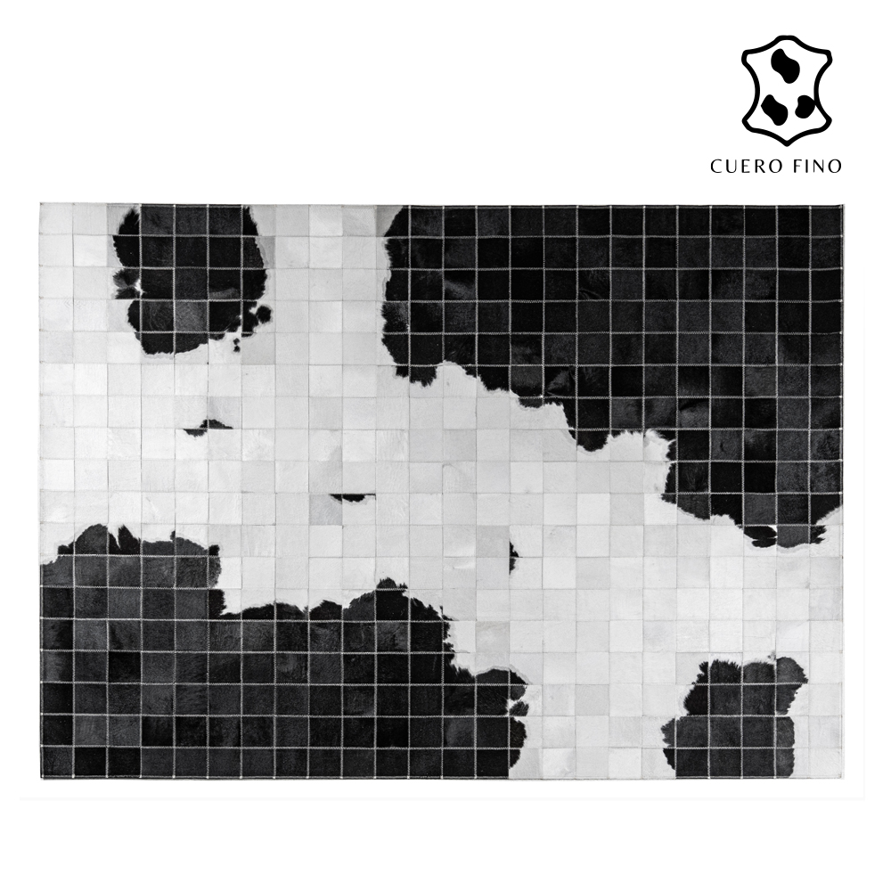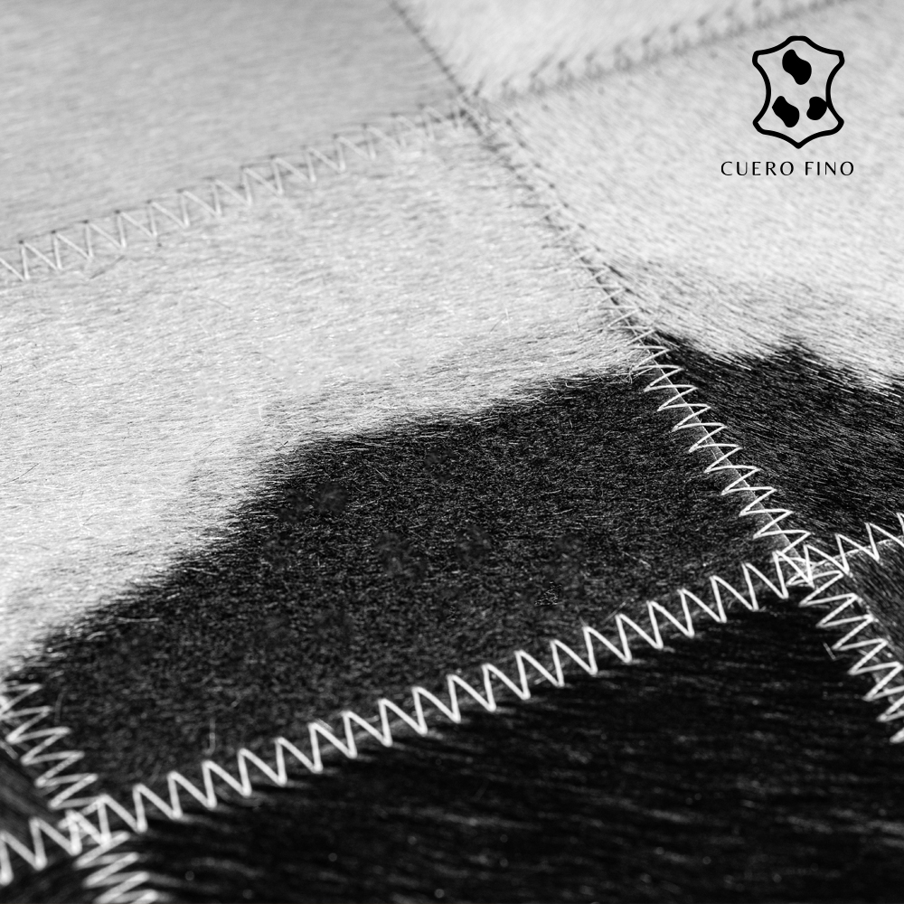 Alfombras de cuero con diseños elaborados a mano 100% cuero vacuno natural cosido a maquina. Tiene un juego de colores negros y blancos. Imagina lo elegante que quedaría esta alfombra en tu espacio.
